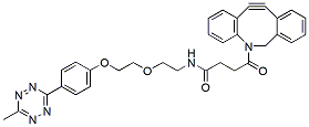 Methyltetrazine-PEG2-DBCO is a chemical compound containing methyltetrazine, PEG spacer and DBCO group. Methyltetrazine is a molecule containing a tetrazine functional group with a methyl substituent. Tetrazines are highly reactive compounds that undergo rapid and selective reactions with strained alkenes, such as trans-cyclooctene (TCO), via the bioorthogonal inverse-electron-demand Diels-Alder (IEDDA) cycloaddition reaction. PEGs are hydrophilic polymers known for their biocompatibility and ability to improve the solubility and pharmacokinetic properties of biomolecules. DBCO is a strained cyclooctyne ring, as mentioned earlier, commonly used in bioconjugation chemistry. It reacts with tetrazine groups via the inverse-electron-demand Diels-Alder reaction, forming stable triazole linkages.